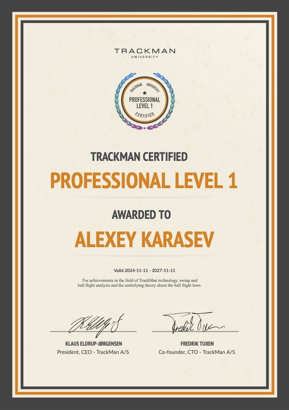 Является членом Сборной России по гольфу с 2014 года, мастер спорта, двукратный серебряный призер Чемпионата России, многократный победитель и призер Всероссийских и международных соревнований. Алексей является обладателем самого дальнего удара в России. На тренировках Алексей отработает постановку стабильного удара и техники, приблизит Ваши показатели к самому дальнему удару в стране.